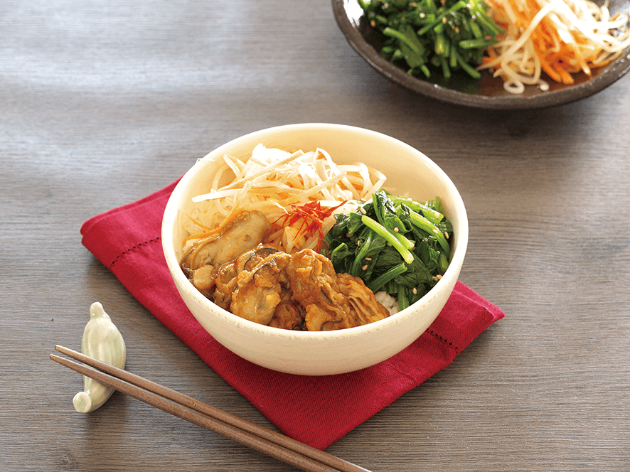 - 押し麦ご飯の上に❶のかき、❷、❸のナムルを盛り、赤唐辛子の小口切りをのせます。