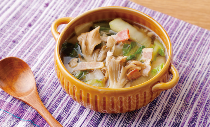 - 鍋にオリーブオイルを入れて中火にかけ、ベーコン、白菜、まいたけの順に入れて炒める。全体に油がまわったら、蓋をして2~3分蒸し焼きにする。
