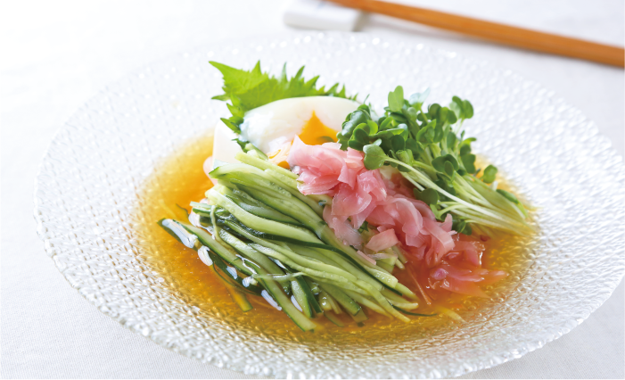 - 豆腐に立てかけるように、きゅうり、しょうがの甘酢漬け、かいわれ菜を盛り付け、たれをかけてできあがりです。