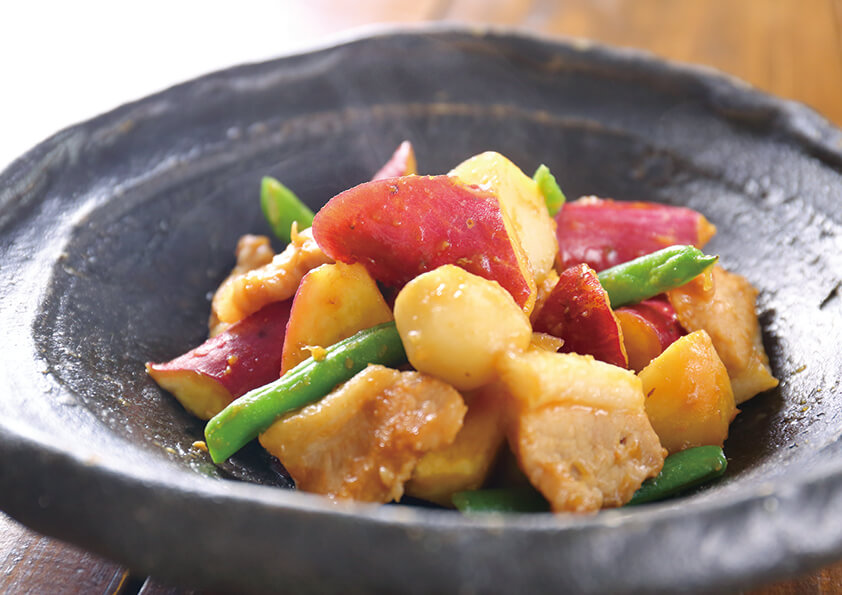 - 鍋にごま油を加えて温めてから、豚肉を入れて裏表を軽く焼き、里いもを加えて軽く油をなじませます。