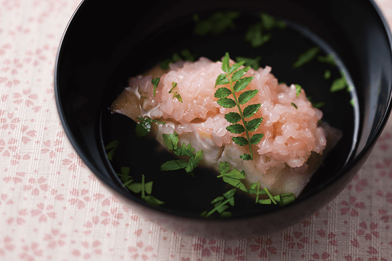 - 椀に❸を盛り、❺を注ぎ、飾り用の木の芽を飾ります。