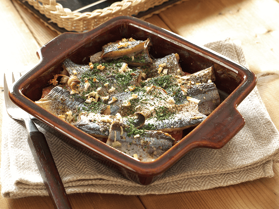 - にんにくのみじん切りを散らし、200℃のオーブンで10~12分焼きます。仕上げにパセリを散らします。