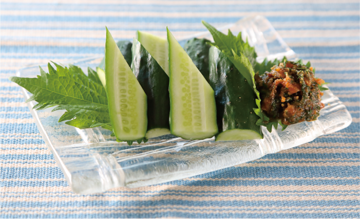- きゅうり1本を食べやすい大きさに切り、❺のみそ(1/10量)を、青じそ(添え用)とともに盛り付けます。(きゅうり1本に1/10のみそをつけて1人分になります。)