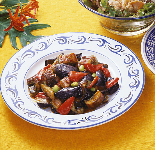 - 中華鍋に多めの油を熱し、水気を切ったなすを加えて炒め、取り出します。