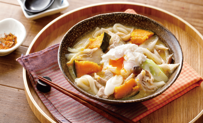 - 鍋に(A)を入れて中火にかける。煮立ったら豚肉を加えてアクを取り、長ねぎとかぼちゃを加えて3分ほど煮込む。豚肉に火が通ったらしめじとまいたけ、うどんを加えて沸騰するまで煮込む。