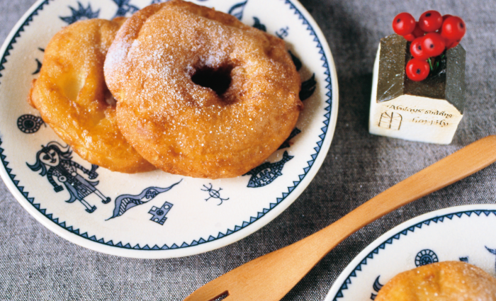 - りんごに❹の生地をつけて、160〜170℃に熱した揚げ油で揚げます。仕上げに粉糖をふります。