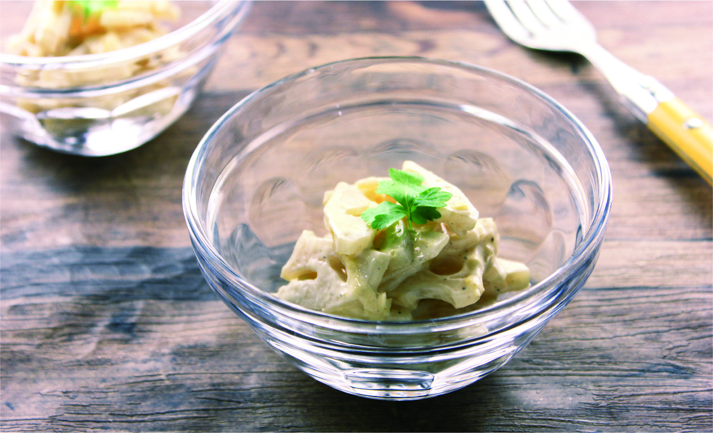 - れんこんは、皮をむいて5mmの厚さのくし形に切り、サッとゆでて冷まします。塩レモンはみじん切りにします。