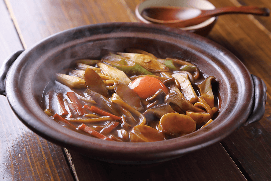 - 具材を少し盛り直して、卵黄を加えてできあがりです。