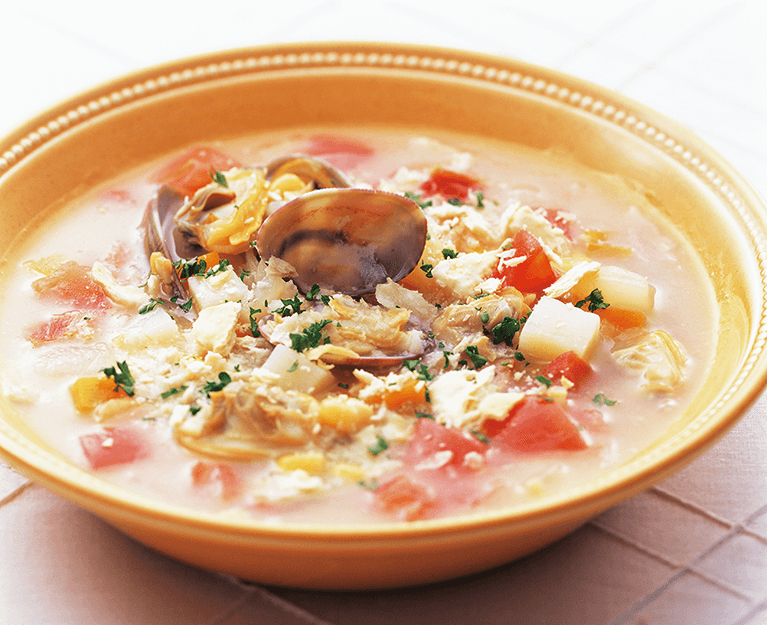 - チキンブイヨンを入れて煮ます。野菜がやわらかくなったらあさりのゆで汁、トマト、あさりのむき身を加えます。塩、こしょうで調味。
