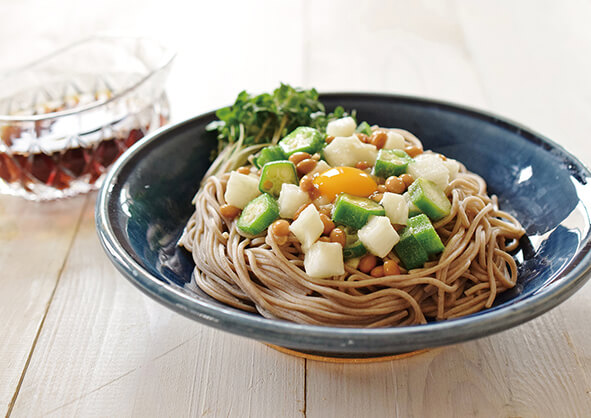 - 長いもは皮をむいて1cm角に切り、オクラは下ゆでして小口切りにし、納豆とともに混ぜ合わせます。