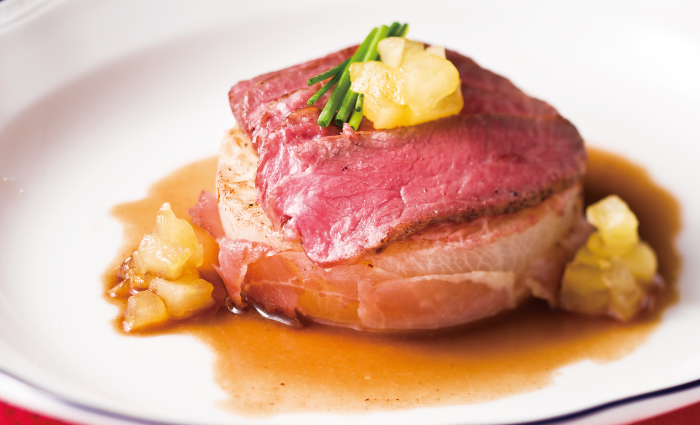- 器につまようじをはずした❸を置き、スライスした❷の牛肉をのせます。周囲に❺のソースを流し、りんごとシブレットを添えます。