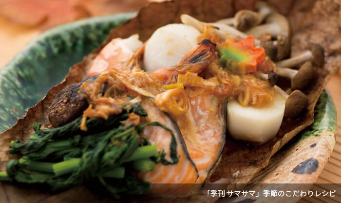 きれいに洗って水けをふいた朴葉に(1)〜(3)を彩りよく並べ、(4)をかけ、温めたガス高速オーブンで焼きます。