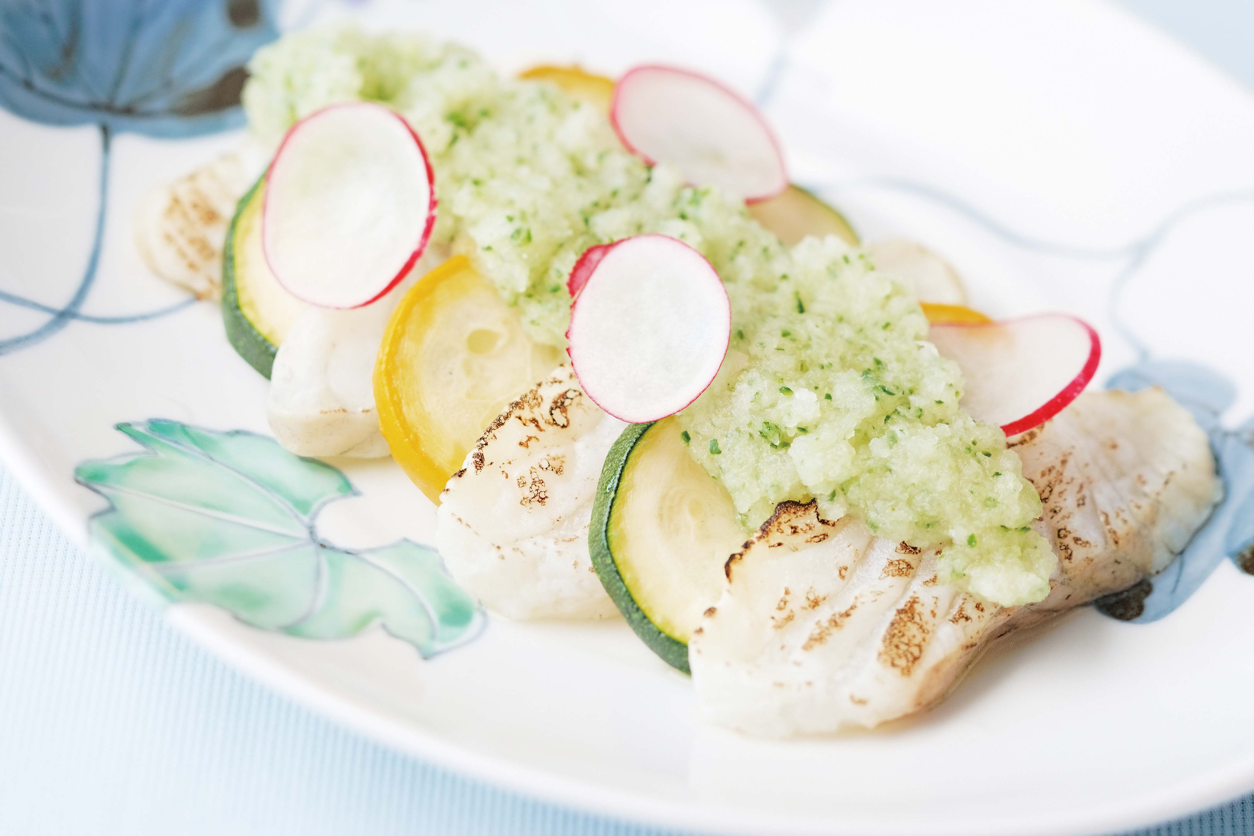 - すずきは厚めにスライスし、両面に塩を軽くふり、しばらくおきます。表面の水気をふき、バーナーで炙ります。(すずきは炙ることにより、香ばしさが増し、おいしく仕上がります。)