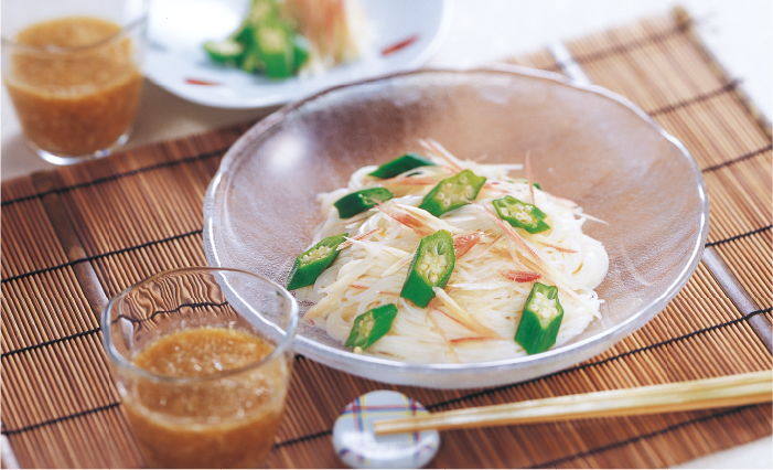 5. そうめんを盛り付け、のオクラ、みょうがをトッピングし、のたれを添えます。