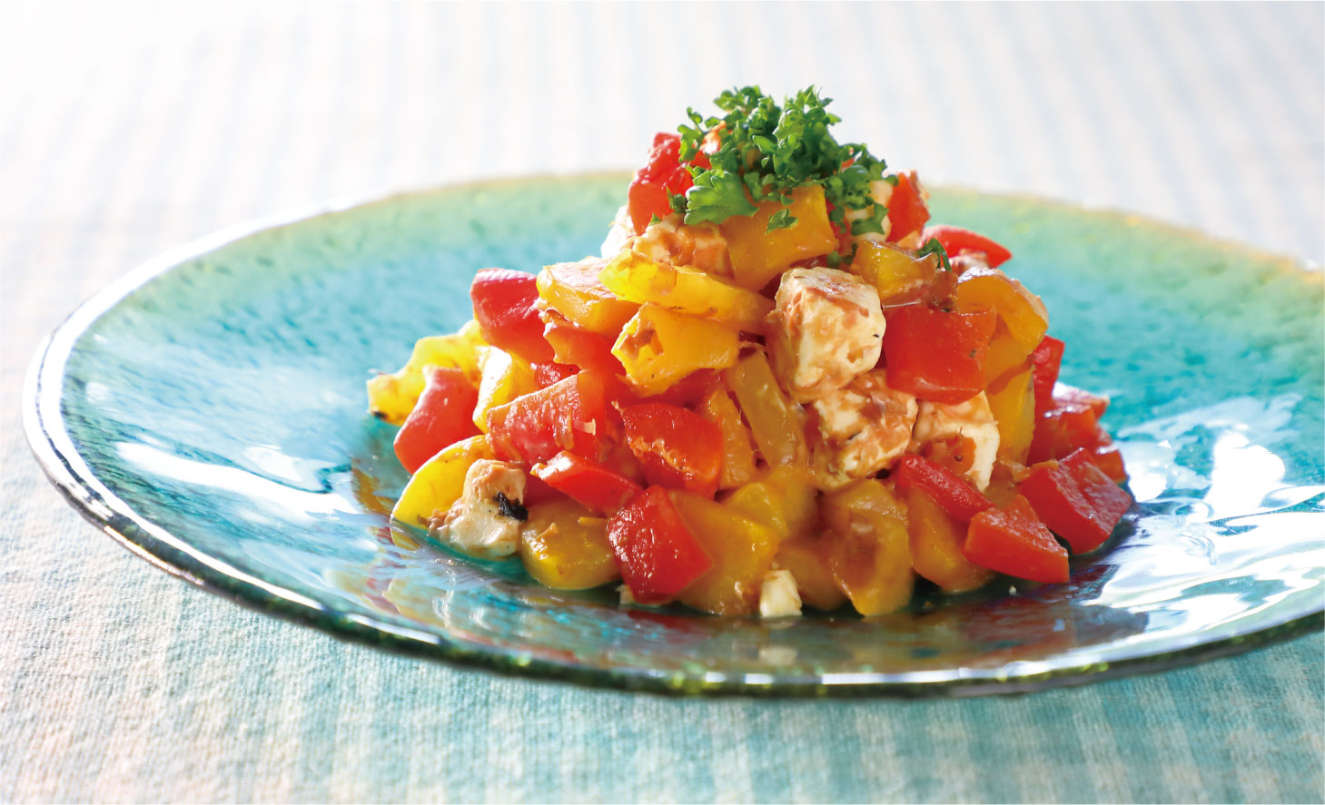 - ボウルにパプリカ、クリームチーズ、削り節、しょうゆを加えてよく和えてできあがりです。