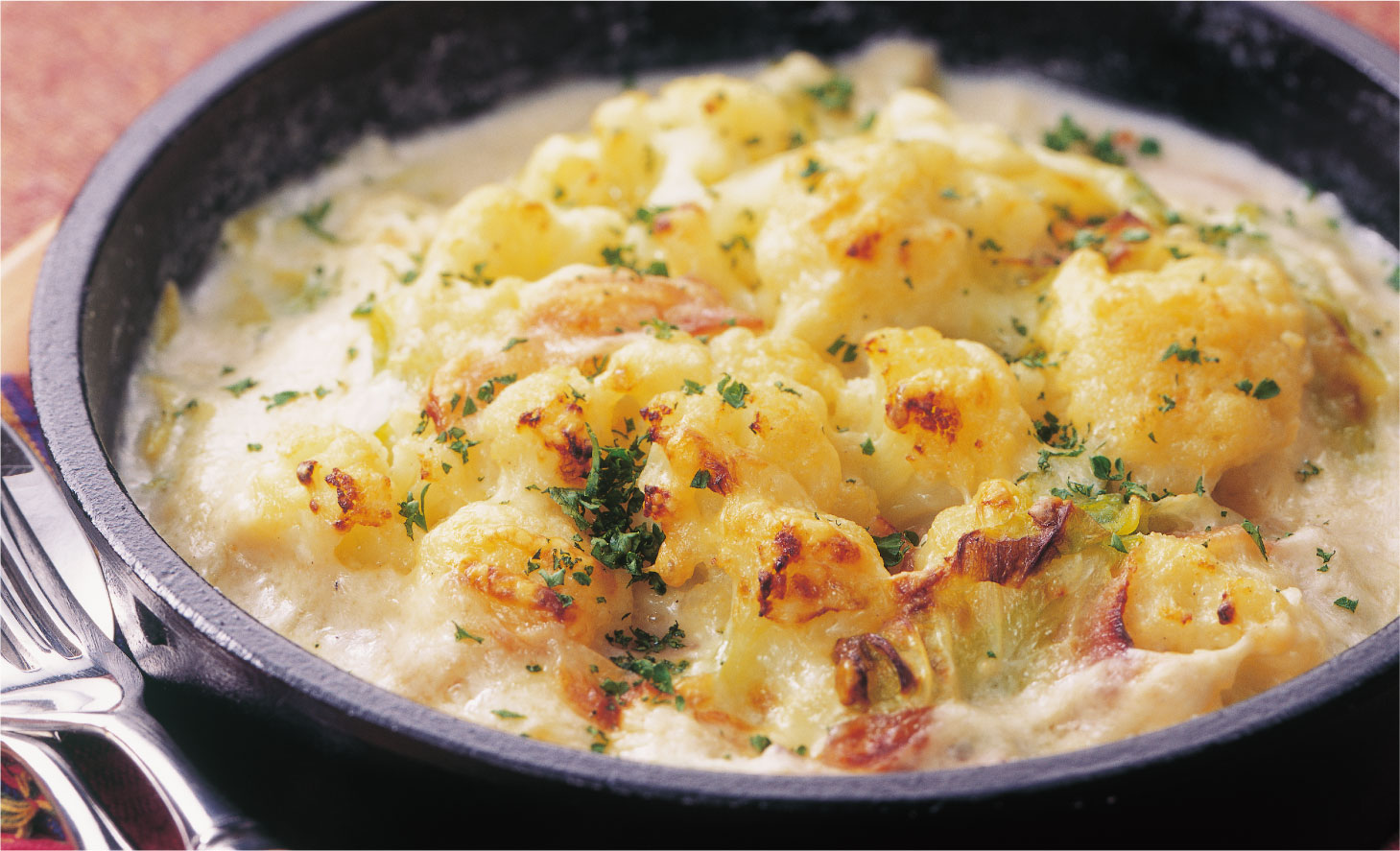 - ❸の具材の上からとろみを付けた❸のソースをかけます。ピザ用チーズをかけて200℃のオーブンで10分焼きます。パセリのみじん切りを散らします。※お好みで揚げた稲穂を添えてもよいでしょう。