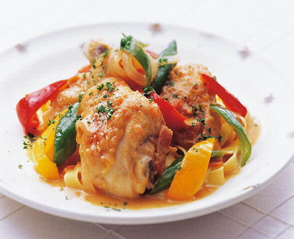 - ❷のフライパンで玉ねぎを炒めます。トマトと白ワインを入れ、白ワインのアルコール分をとばしてから、チキンブイヨンを入れます。沸騰したら❷の鶏肉を戻し入れ、塩、こしょうをして中火にします。ふたをして5分煮て、途中アクを取り除きます。パプリカ、甘長唐辛子、ベーコンを加えてさらに5分煮ます。