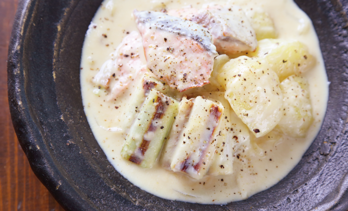 - 焼いた長ねぎ、焼いた鮭、加熱したじゃがいもを❻に加えて、弱火で5分程度煮ます。